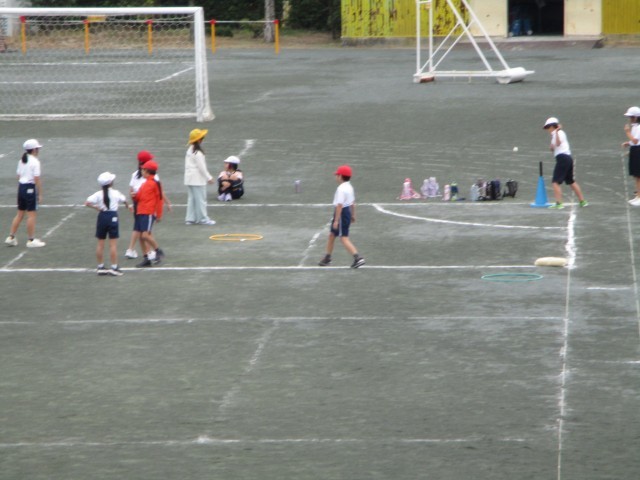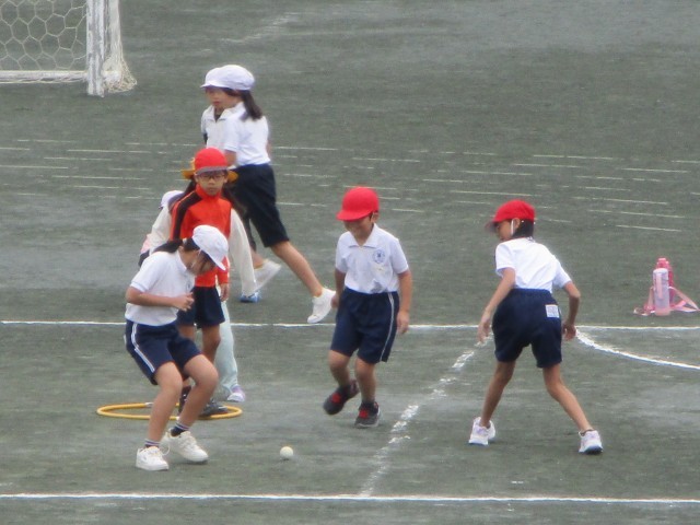 ハンドベースボールの授業のようすです。守備のチームはみんなが協力してアウトを取っていました。