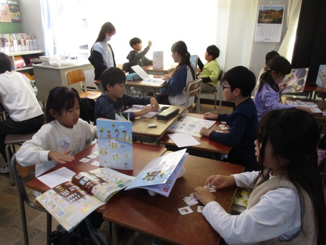 外国語の時間では、文房具を英語で伝え、同じ文房具のカードを出すゲームをペアで行いました。