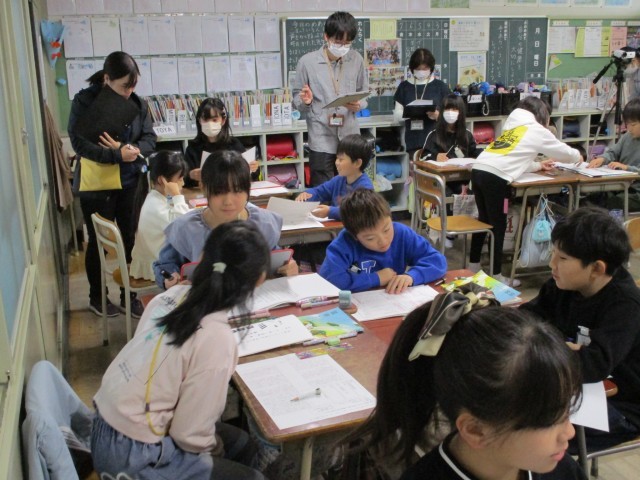 国語の時間、研究授業を行いました。筆者の考えを改めてとらえるために、「はじめ・中・終わり」の文章構成を班で話し合い、理由も考えて発表しました。実家里とした話し合いができていました。