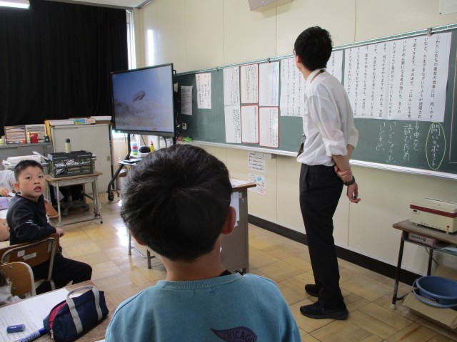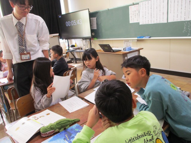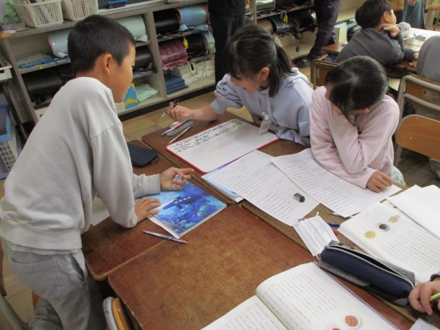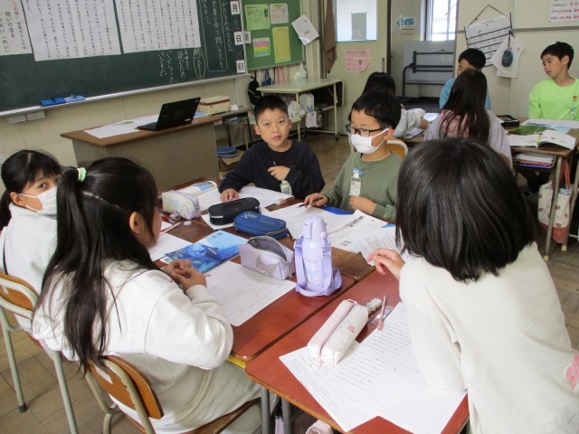 国語「すがたをかえる大豆」の説明文の学習です。「はじめ・中・終わり」の段落の中で、問いを書くならどんな文がいいのか、グループで話し合って考え、ホワイトボードに書いて発表しました。協力して一生懸命に取り組んでいました。