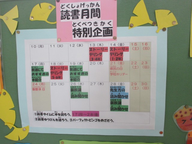 いちょう読書月間に入っています。たくさん本を読んで、心に栄養を与えましょう。さまざまな特別企画も予定されています。楽しみですね。