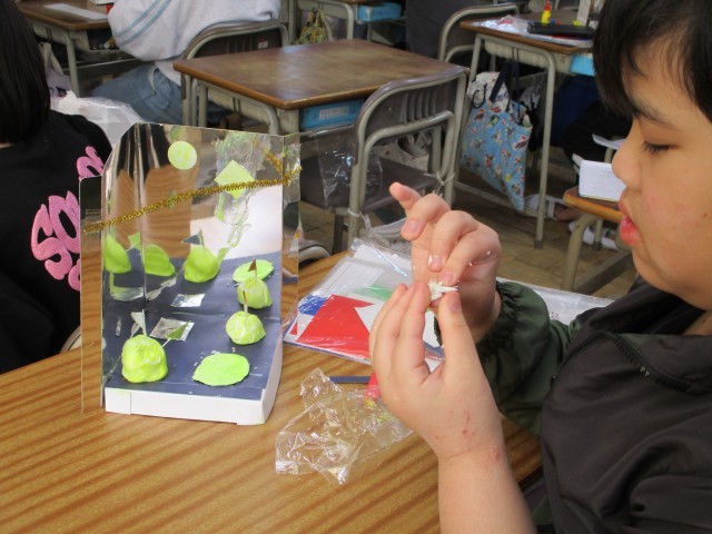 図工の作品づくりの時間です。完成まであと少し。黙々と取り組んでいました。