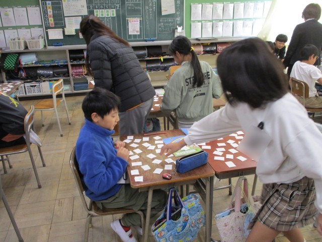 アルファベットのカードを裏向きにして、ペアで神経衰弱をしました。アルファベットに慣れ親しみました。