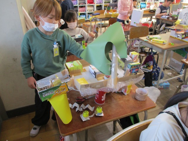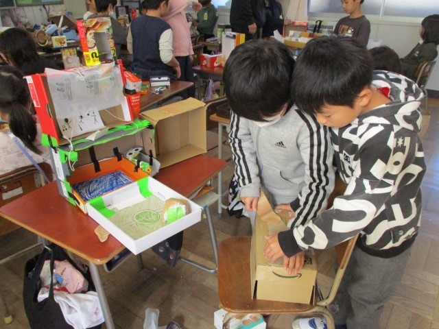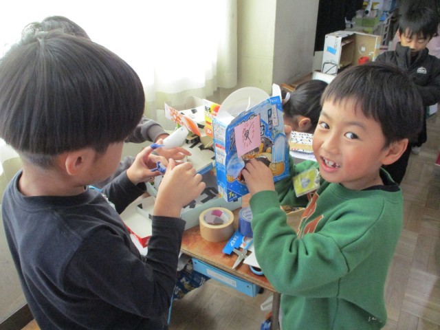 空箱を使って、アイデアいっぱいのすてきなおうちを作りました。中にはエレベーターも作っている子もいました。素晴らしいですね。