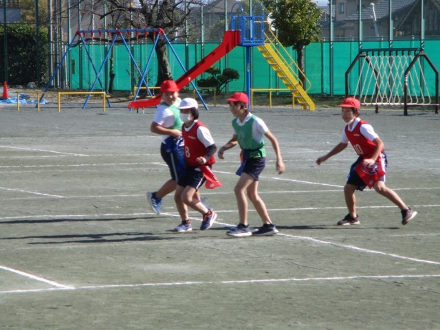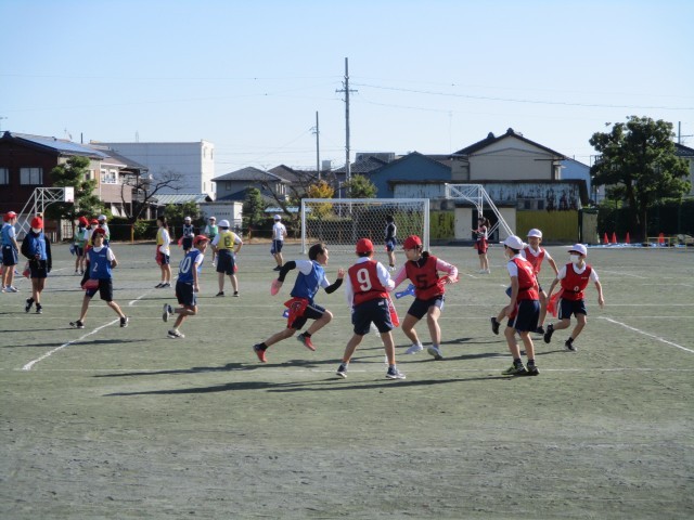 体育でフラッグフットボールにチャレンジしていました。3人1組で作戦を立ててボールを持った選手がゴールラインまで走るゲームです。とても楽しそうでした。