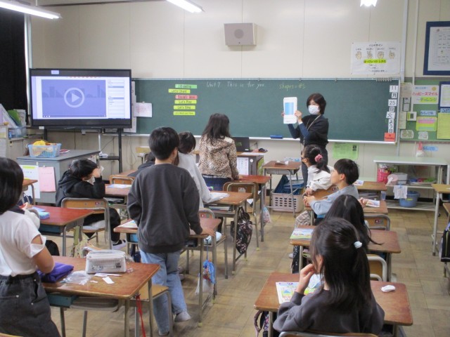 三角や四角、丸、星型などのカードを見せ、英語で何というのかの発音練習をしました。知っているものもあれば、難しいものもありました。