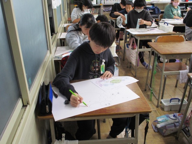 海の生き物を題材にした読書感想画を描いています。スケッチも終わりに近づき、色塗りに入っていきます。
