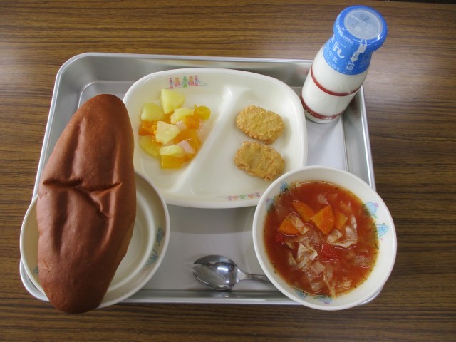 パン 牛乳 チキンナゲット みかんゼリー和え ミネストローネ