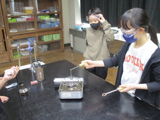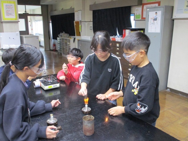 もののあたたまり方の実験を行いました。実験するために、火の扱い方についても先生から教わりました。マッチの擦り方、アルコールランプの使い方、カセットコンロのセットの仕方など練習しながら、協力して上手に実験しました。