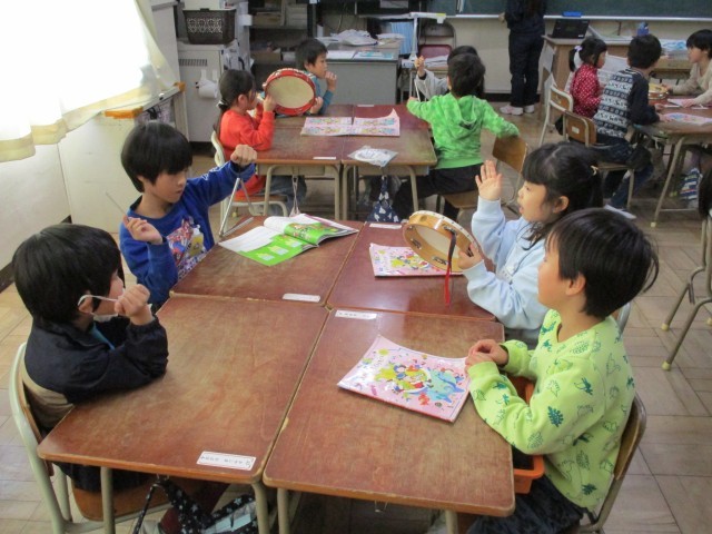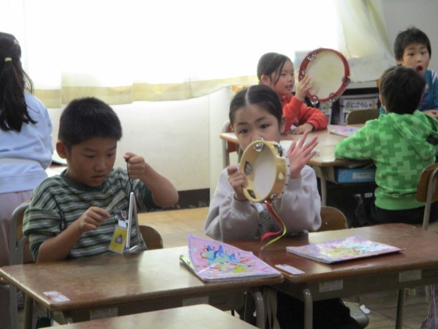 音楽の時間、鍵盤ハーモニカで指使いを練習しました。グループごとにトライアングルやタンバリンを使って、リズム演奏の練習もしていました。