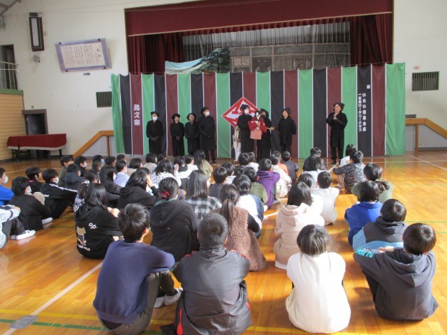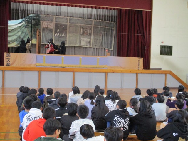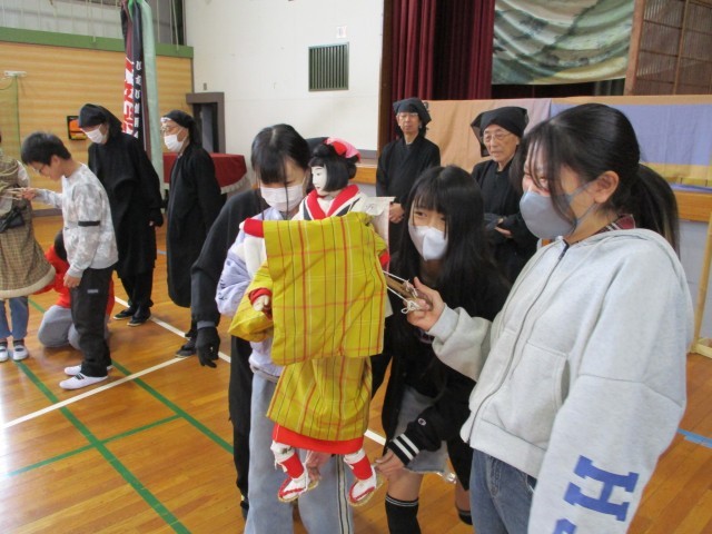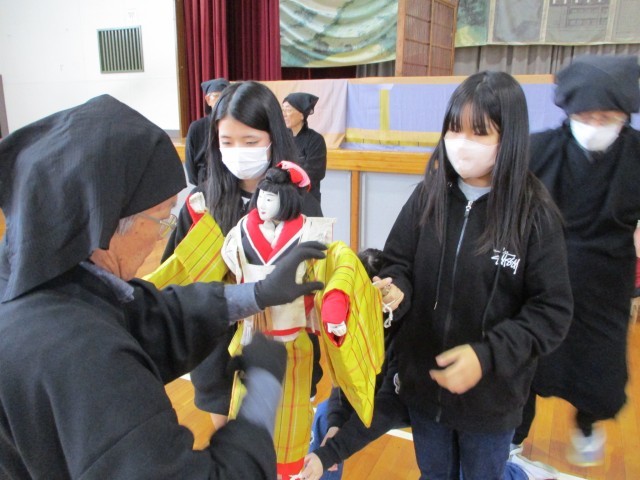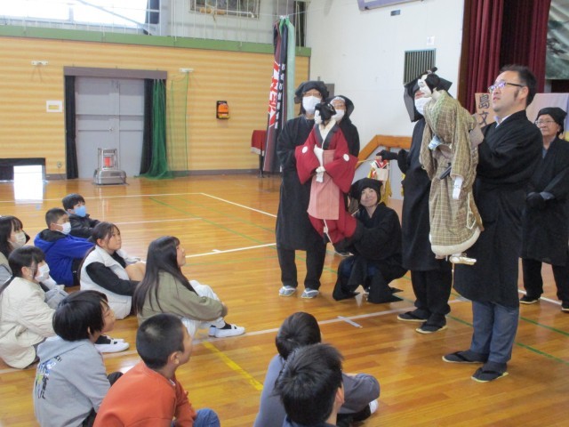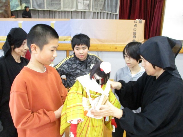 6年生は毎年一宮市の伝統芸能「島文楽」の体験学習を行っています。今日は島文楽保存会のみなさんに来ていただきました。劇を観賞し、実際に人形の捜査の体験もさせていただきました。貴重な文化財に触れ、歴史と文化を体験する良い機会となりました。保存会のみなさん、本当にありがとうございました。