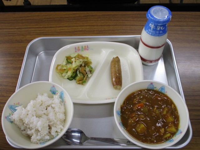 ご飯 牛乳 ポークカレー 焼きフランクフルト 福神漬和え