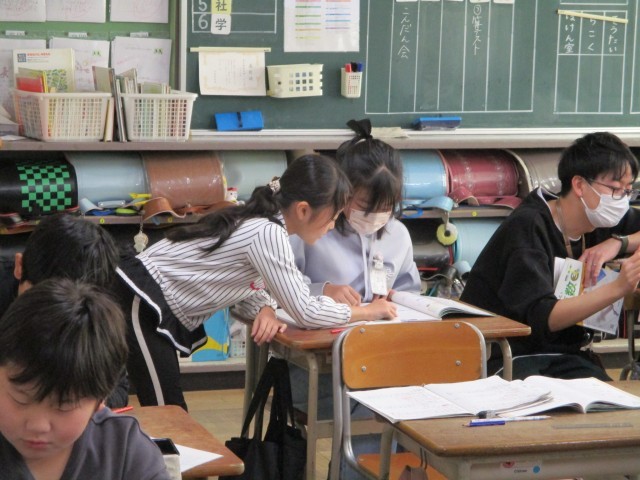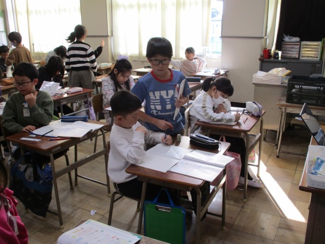 算数の時間、問題が早く解けた子から、ミニ先生となって学級の仲間にヒントを与えて問題が解けるようにサポートしています。学級の力がさらに高まり合っていますね。