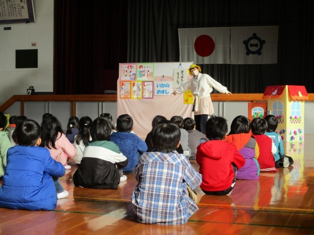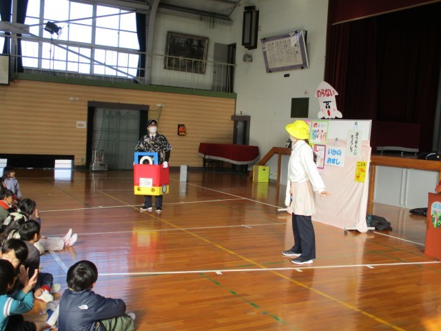 防犯教室がありました。「いかのおすし」に関するお芝居を見て、知らない人についていかない、知らない車に乗らない、大声で助けを求める、すぐに知らせることを改めて確認しました。また、家で留守番しているときもカギを開けないなど、しっかりと守り自分の身を守ることを楽しく学びました。ありがとうございました。