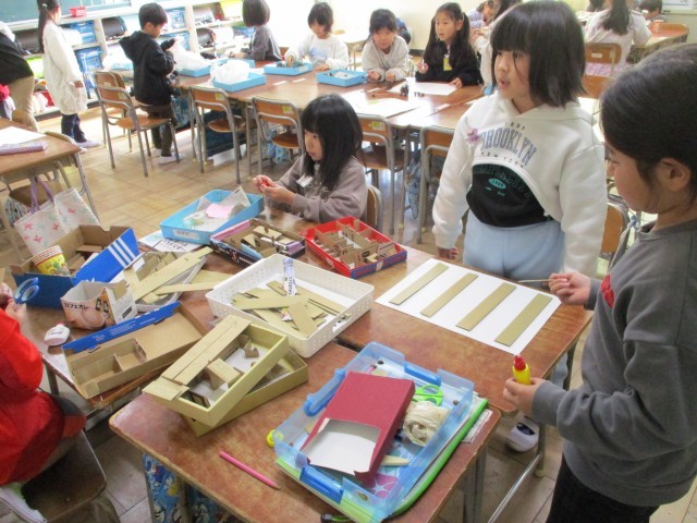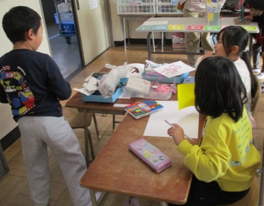 生活科で木の実を使っておもちゃを作りました。そのおもちゃでほかのクラスの子といっしょにあそぶために、準備をしました。友達と一緒にコーナーの張り紙をつくったり、おもちゃを改良したりしながら楽しみました。