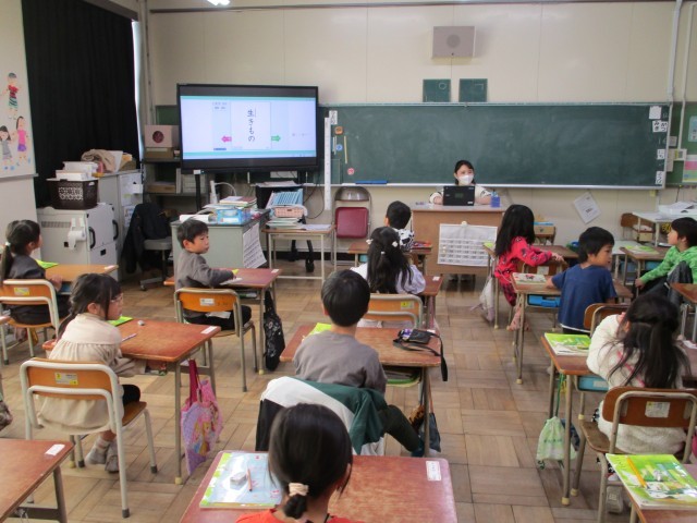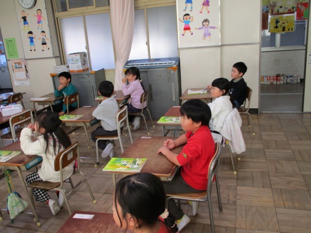 今までに習った漢字の復習です。画面に映し出された感じは何と読むのか、一人ずつ順番に読んでいきました。ほとんど正解でした。
