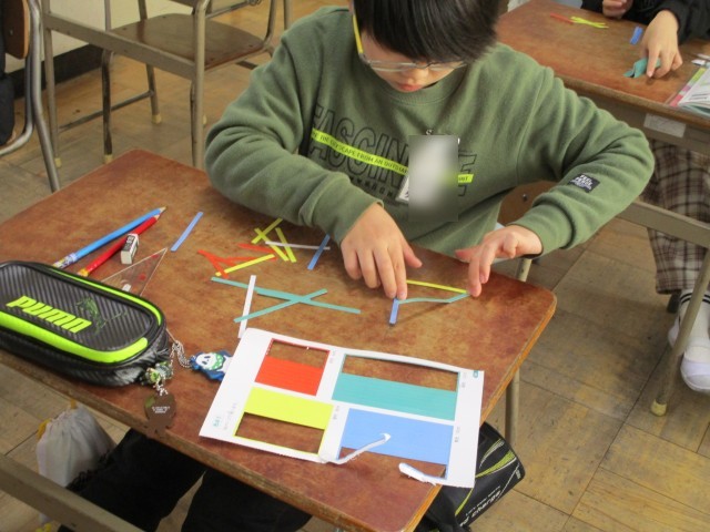 長さのちがう紙の棒を使って、さまざまな形の三角形を作ってみました。たくさんできました。