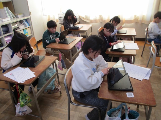 学習発表会に向けて、Canvaプレゼンテーションで調べたことをまとめています。初めての挑戦でも夢中になって取り組んでいました。