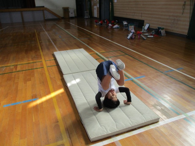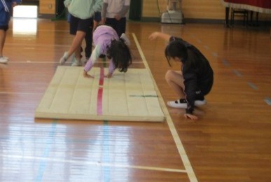 マット運動をしました。前転や後転、側転につながる動きなど楽しく行いました。