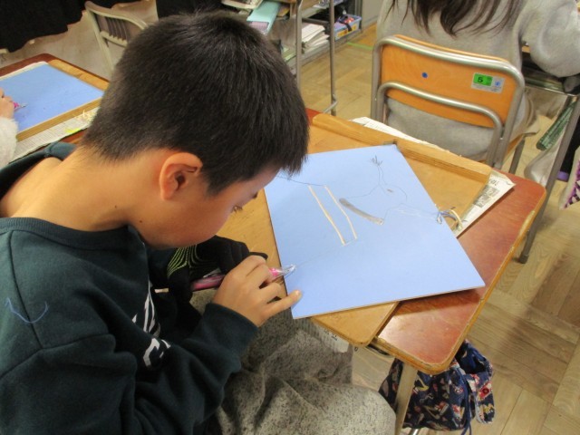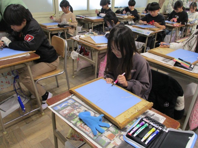 版画を作成しています。今日は彫りの作業です。説明を聞き、慎重に彫っていました。