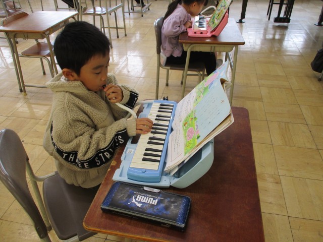 鍵盤ハーモニカで曲の練習です。1年前と比べてずいぶんと上達していました。