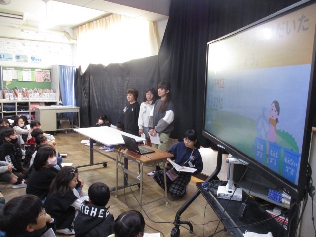 本日、4年生の学習発表会がありました。10月の校外学習で「あいち環境学習プラザ」に行き、環境について学びました。その後、学校の授業でインターネットで調べて理解を深めました。またクロムブックを使って、見せる資料をそれぞれ作りました。