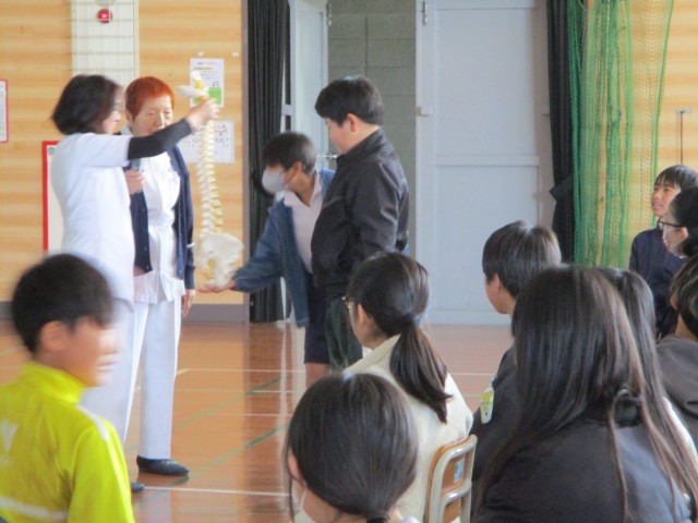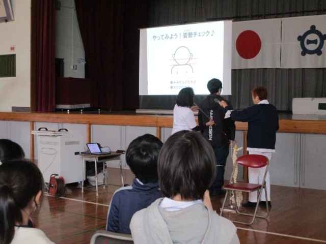 今年度の学校保健委員会は、姿勢調整師の講師の先生方をお招きして姿勢教室を開催しました。正しい姿勢について、背骨についての分かりやすいお話ややってはいけない姿勢、効果的なストレッチの実践など、とても楽しく、ためになるお話をしていただきました。この教室で学んだことを実践し、正しい姿勢になるようにしていきたいと思います。講師の先生方、ありがとうございました。