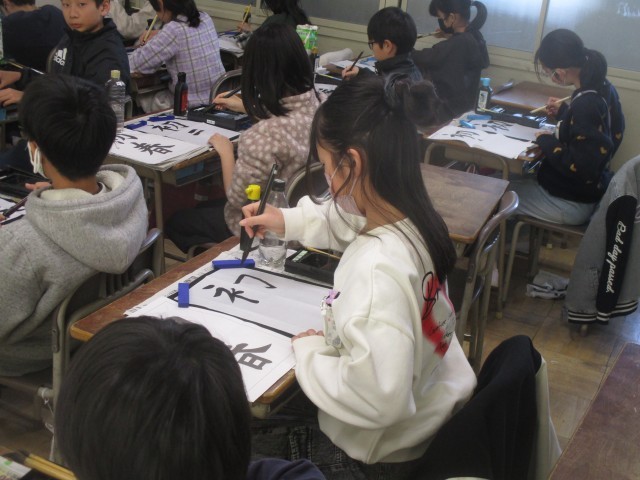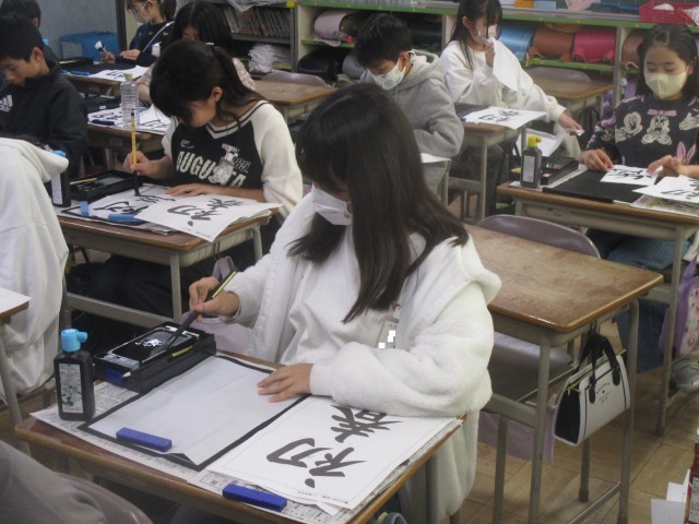 「初春」を書いています。筆づかいや始筆の位置に気をつけながら書いています。