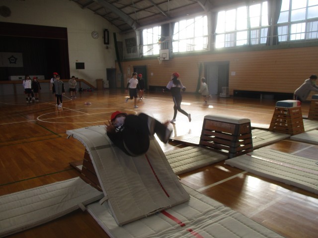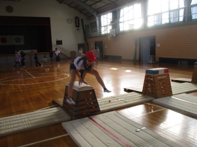 跳び箱で開脚飛び、抱え込み飛び、台上前転の練習をしています。みんな、かなり上達してきました。
