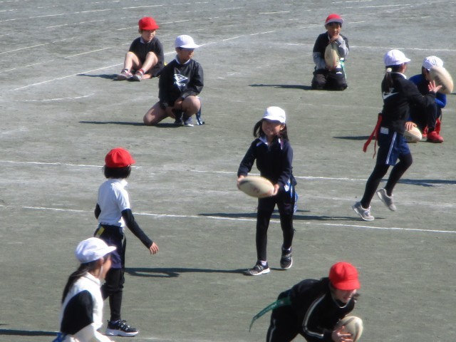 体育ではじめてタグラグビーに挑戦です。ボールを持っている人が前に走ってパスするのが難しいですね。