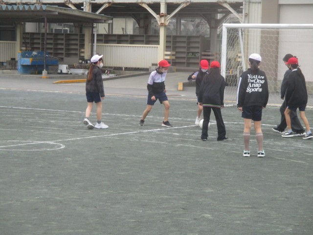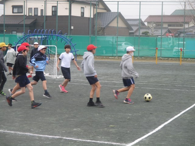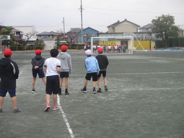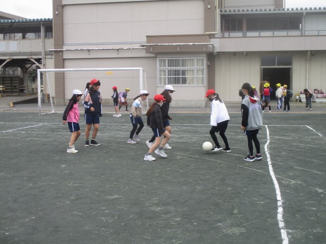 体育でサッカーをしています。みんな声をかけながら楽しくゲームをしています。