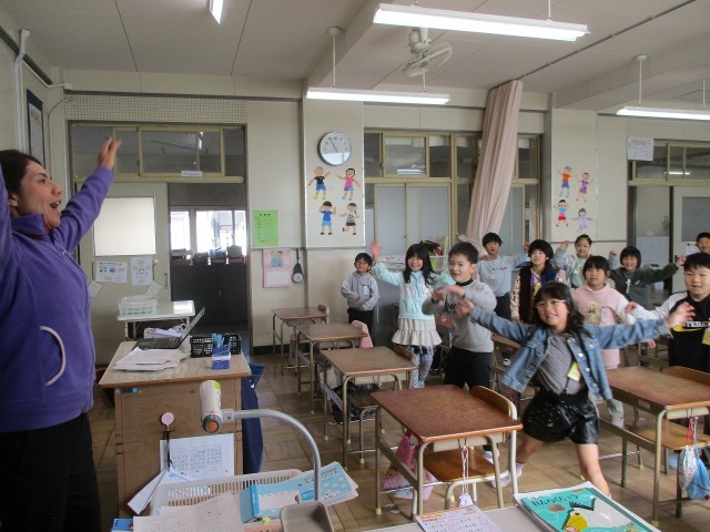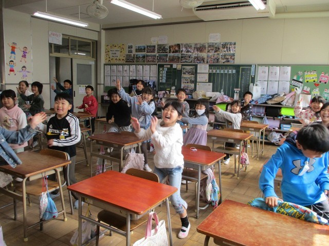 3学期最後の英語の授業がありました。ALTの先生と英語の歌に合わせて掛け声を言ったり、踊ったりしました。