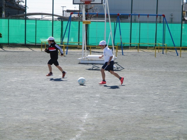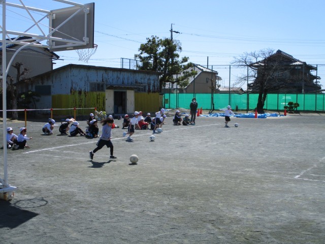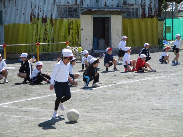 サッカーボールでドリブルリレーをしました。ボールをけって走りながらコントロールするのは難しそうでしたが、頑張ってつないでいました。