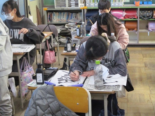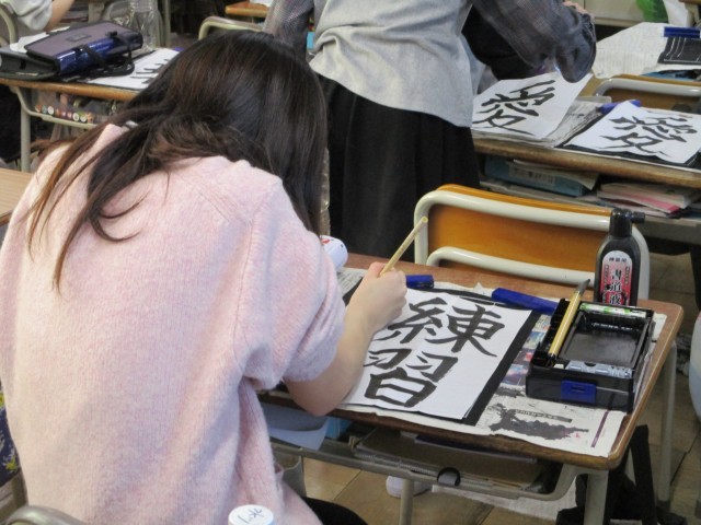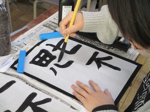 書写の時間、1年間のまとめとして自分が気に入った言葉を使って、毛筆で書きました。1年間で字形を整えて書けるようになりました。