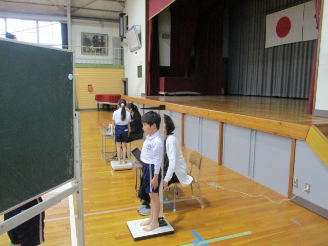 保健室の先生から、健康で安全に学校生活を送るために、廊下歩行など気をつけることを確認しました。そのあと、身長や体重を測りました。どれだけ成長したのか楽しみですね。
