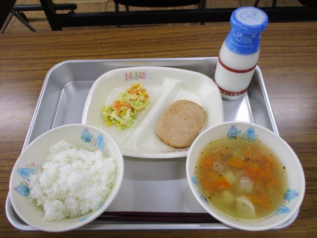 ごはん 牛乳 ボロニアステーキ 春キャベツのサラダ かぶのコンソメスープ