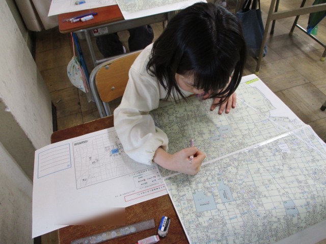 3年生から社会科の授業が始まりました。学区の地図を使って、自分の家を見つけたり、ようすを確認したりしました。