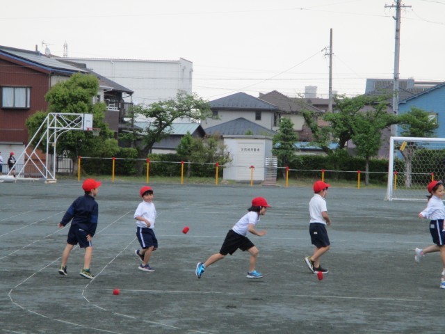 お手玉を使って、投げる動作を覚えました。遠くへ投げられるように何度も練習しました。