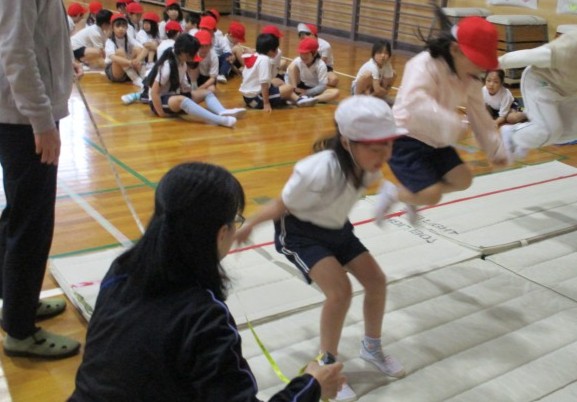 体力テストで、立ち幅跳びを行いました。遠くへ頑張って跳んでいました。