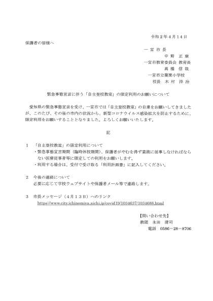 4.14 緊急事態宣言に伴う「自主登校教室」の限定利用のお願いについて