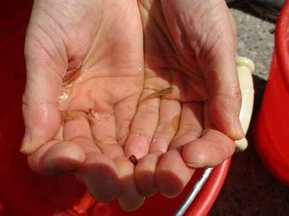葉栗っ湖の中にはメダカがたくさんいました。この手は誰の手だと思いますか。