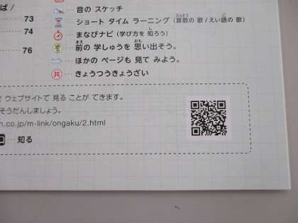 QRコードを読み取れる機器があれば、算数では1年生の問題を復習できたり、これから習うことを予習することができます。音楽の教科書では、いろいろな音が聞けます。