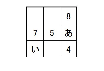 今日は頭の体操ということで、魔法陣という算数の問題を用意してみました。魔法陣とは、たて、横、ななめに数字を足したとき、すべて同じ数になるというものです。「あ」と「い」にどんな数字が入るか考えてみてください。ただし、魔法陣に使われる数字は1〜9までの数字が1回ずつ使われます。