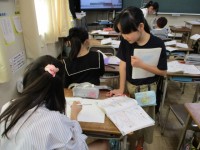 図工の時間、多色刷り版画を制作しています。塗ったところに色がつくように、彫る部分を考えて彫りました。絵の具をのせて、何度も刷り、完成に近づけていました。