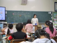 昨日は1年生お初の英語活動でした。英会話助手の先生に色の英語を教えてもらいながら、歌を歌ったり、カードに色を塗ったりしました。