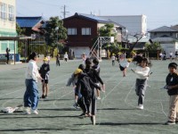 中間の休み時間になると、外に出てリズム縄跳びにチャレンジです。放送が流れると、た...