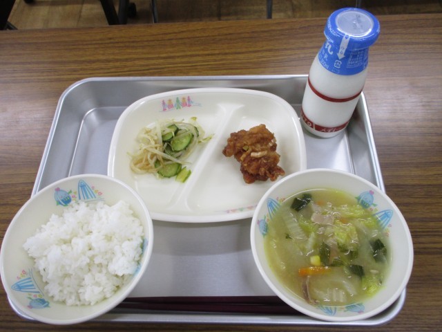 <今日の給食>ご飯 牛乳 ユーリンチー もやしの中華和え 中華コーンスープ<...
