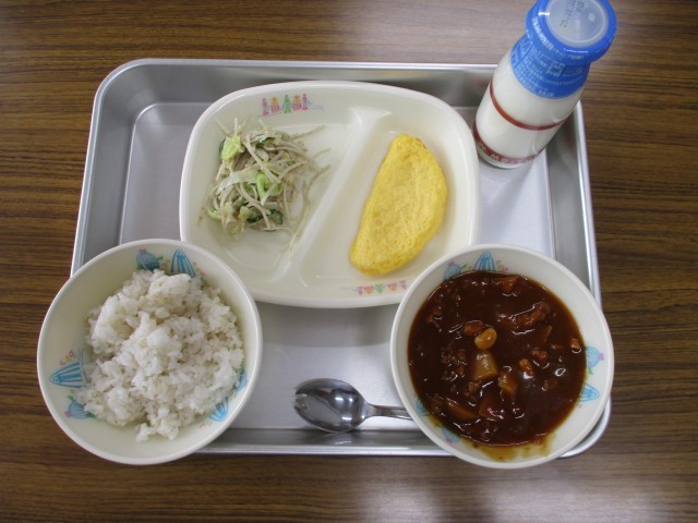 <今日の給食>ご飯 牛乳 お豆のブラウンシチュー オムレツ ごぼうサラダ<献...