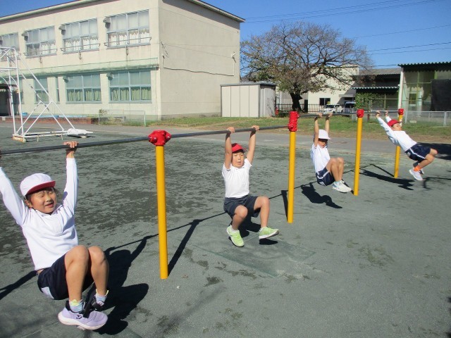体育で「てつぼうあそび」をしました。てつぼうのにぎりかたに気をつけながら、ぶらさ...