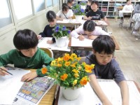 図工で鉢植えの花をスケッチしました。花一輪を真ん中に描き、そこから茎や葉などを付...